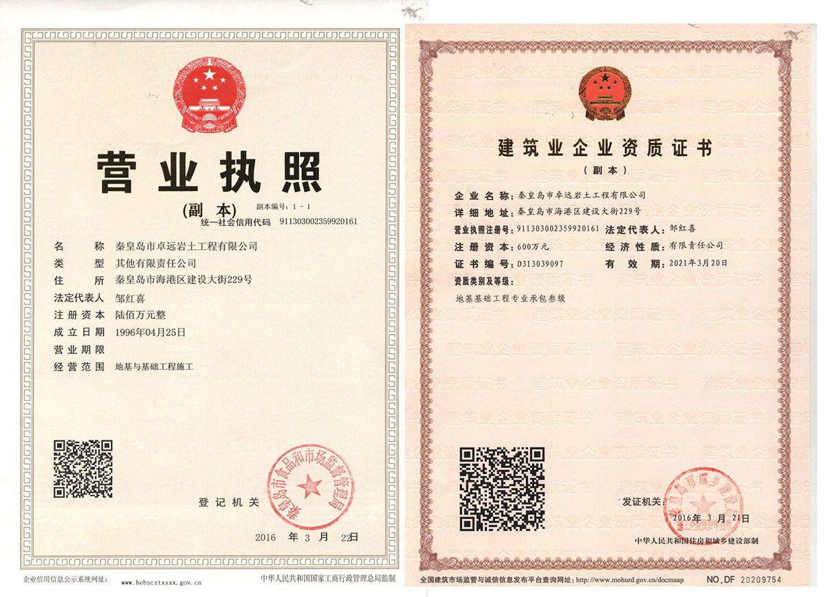 秦皇島市卓遠巖土工程有限公司成立于19964月,是較旱在秦市從事巖土工程施工的單位之一,擁有碩士生3、高級工程師4、國家注冊巖土工程師3、項目經(jīng)理5、巖土工程師15、市建委專(zhuān)家2人、預算師2、機械師2。擁有強夯機1臺、水準儀2臺、全站儀2臺、夯擴機2臺、長(cháng)螺旋樁機2臺。